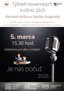Workshop o tom, aké dôležité je čítať deťom od malička, o tom, čo im to prináša, čo to v nich rozvíja, ale aj o tom, čo je pre ne vhodné. Rady, tipy a odporúčania od odborníčky na čítanie deťom Alžbety Uríkovej z OZ Krajina čitateľov. Workshop je určený pre rodičov mladších detí. PRIHLASOVANIE NA TELFÓNNOM ČÍSLE 054 47 22 105 ALEBO OSOBNE NA ODDELENÍ LITERATÚRY PRE DETI A MLÁDEŽ.