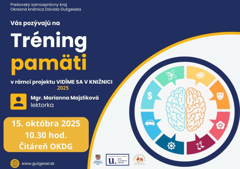 Pozývame Vás na Tréning pamäti s lektorkou Mgr. Mariannou Majzlíkovou, ktorý sa uskutoční pre širokú verejnosť od 10.30 hod. v študovni OKDG v rámci projektu Vidíme sa v knižnici 2025.